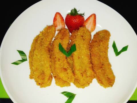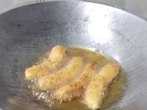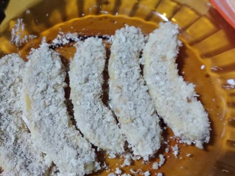 - 1.Kupas pisang, kmdn belah jd dua, sisihkan. Tuang secukupnya tepung pisang goreng ke dlm piring, kmdn encerkan dgn sdkt air (atau sesuai instruksi dlm kemasan). Di piring lain, beri tepung roti secukupnya. Note: sy pake bread crumbs yg putih.